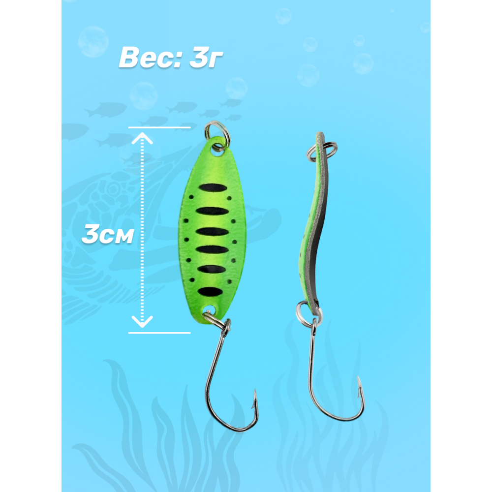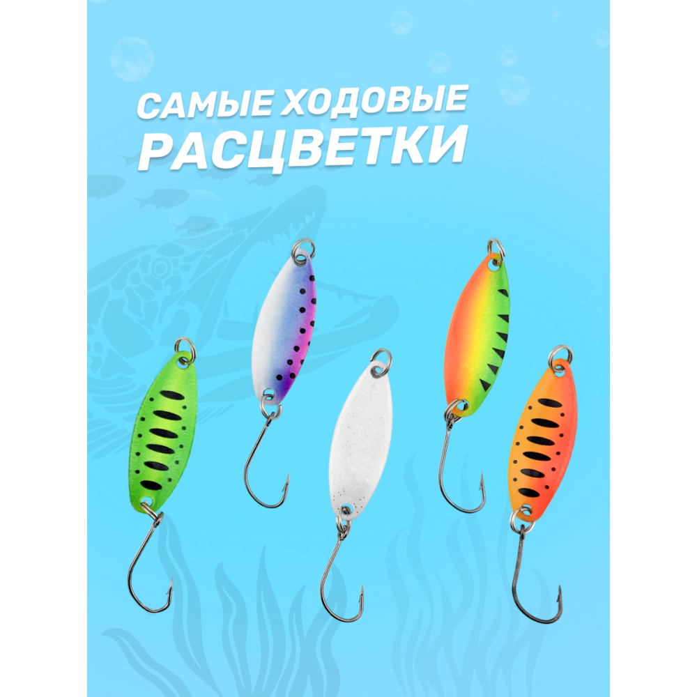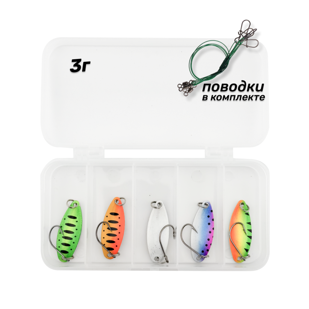 Набор блесен на форель, окуня и голавля. В наборе 5 колебалок с поводками в коробке. Вес 3 г, длина 3,5см. В наборе самые рабочие расцветки приманки. Они зарекомндовали себя как наиболее эффектиные для зимних блесен на окуня и форель. Окраска порошковая, покрыта защитным лаком, способна выдержать не одну атаку хищника. Тип приманки: колебалка на форель, окуня или голавля.